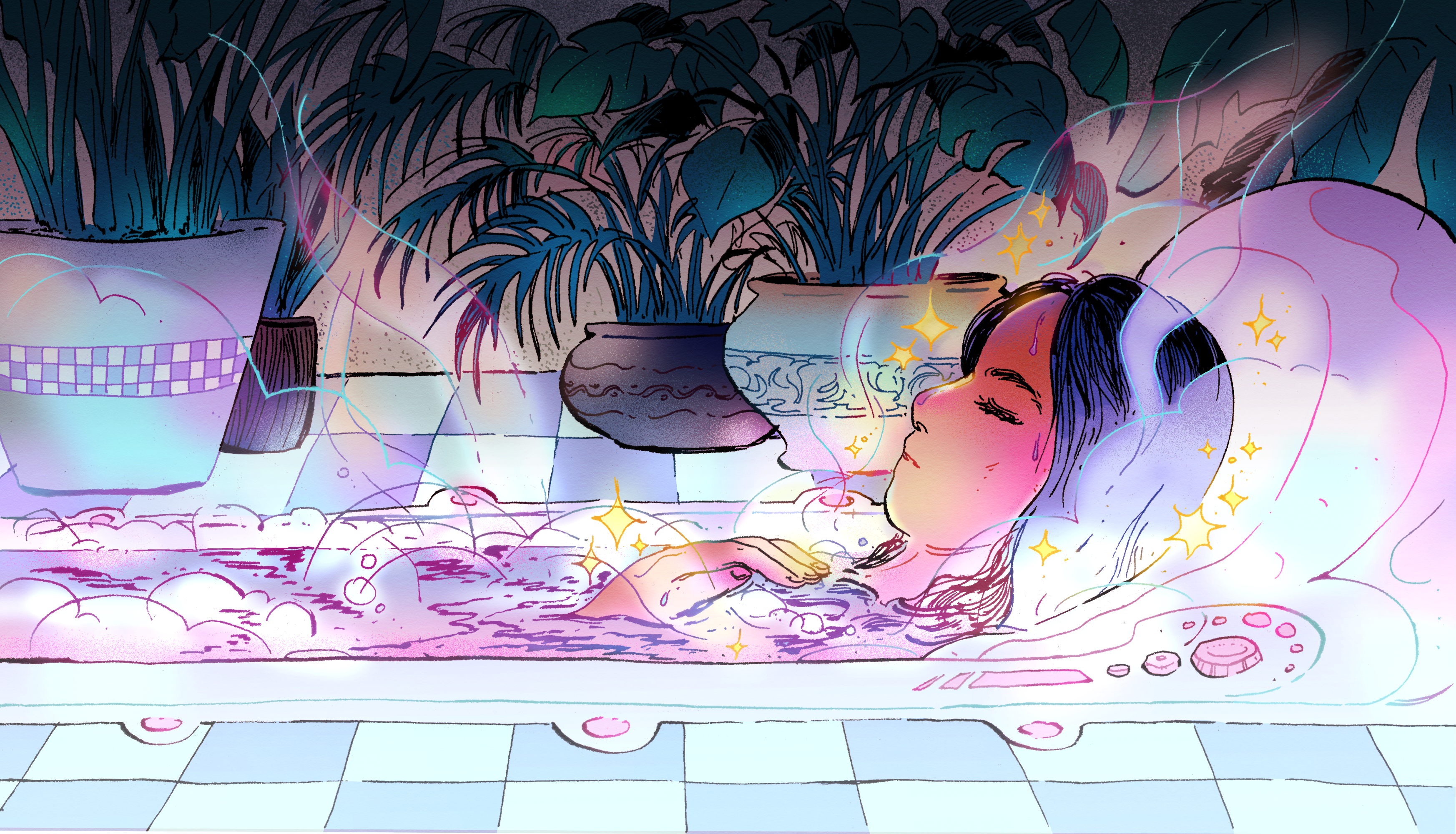 Digital illustration featuring the side profile of an East Asian person with shoulder-length hair soaking in a hot tub of magical, healing water. Steam and sparkles envelop the person’s head as well as their hand, which rests atop their chest while they lie back with their eyes closed. In the background, potted tropical plants adorn a checkerboard tile floor.