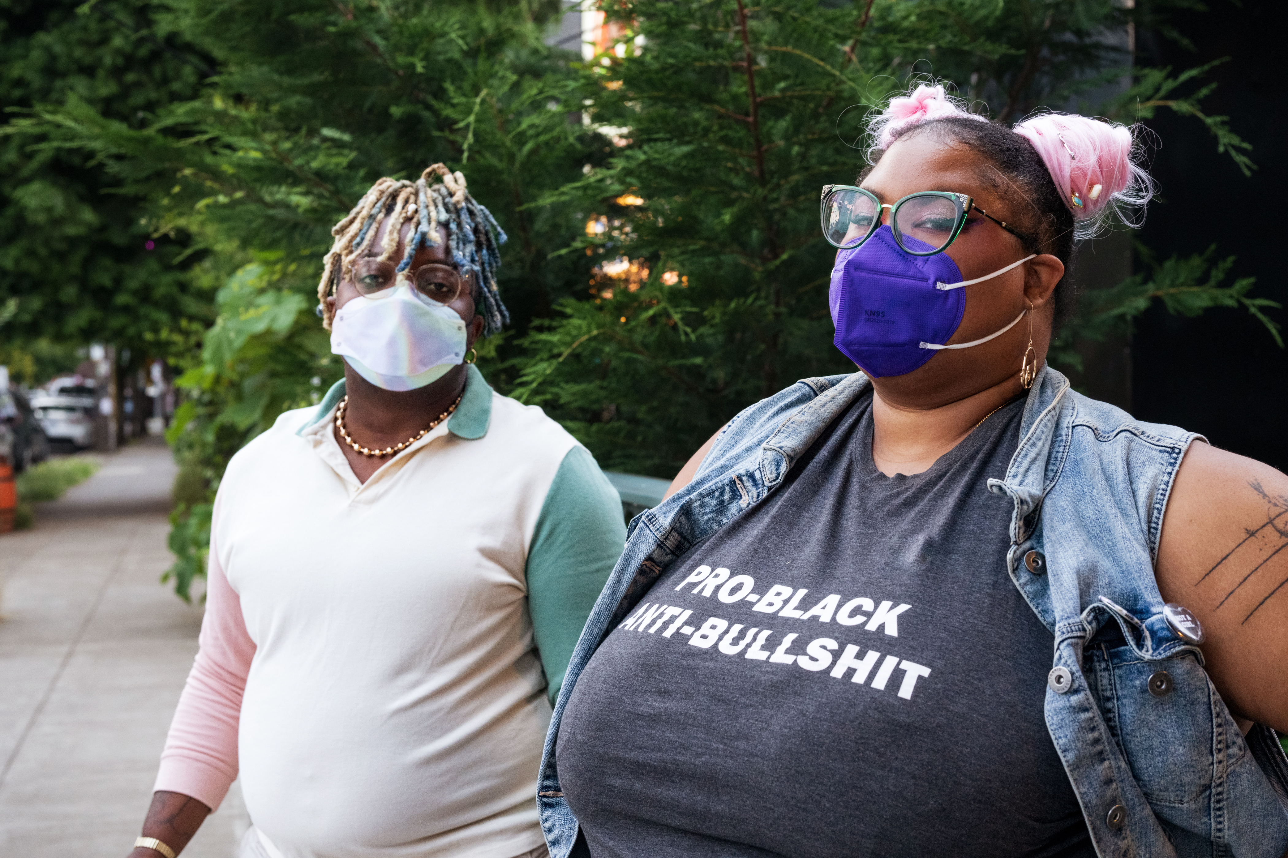 Angled close-up of two Black people on a sidewalk with abundant deep green foliage in the background. On the left, a transmasculine person showcases ombré blonde and blue locs, oval glasses, a holographic rainbow mask, and a white shirt with color blocked pink and mint green long sleeves. On the right, the non-binary person has pastel pink space buns, cat eye eyeliner paired with cat eye glasses, an indigo purple mask, and a denim vest over a Pro-Black Anti-Bullshit tank top.