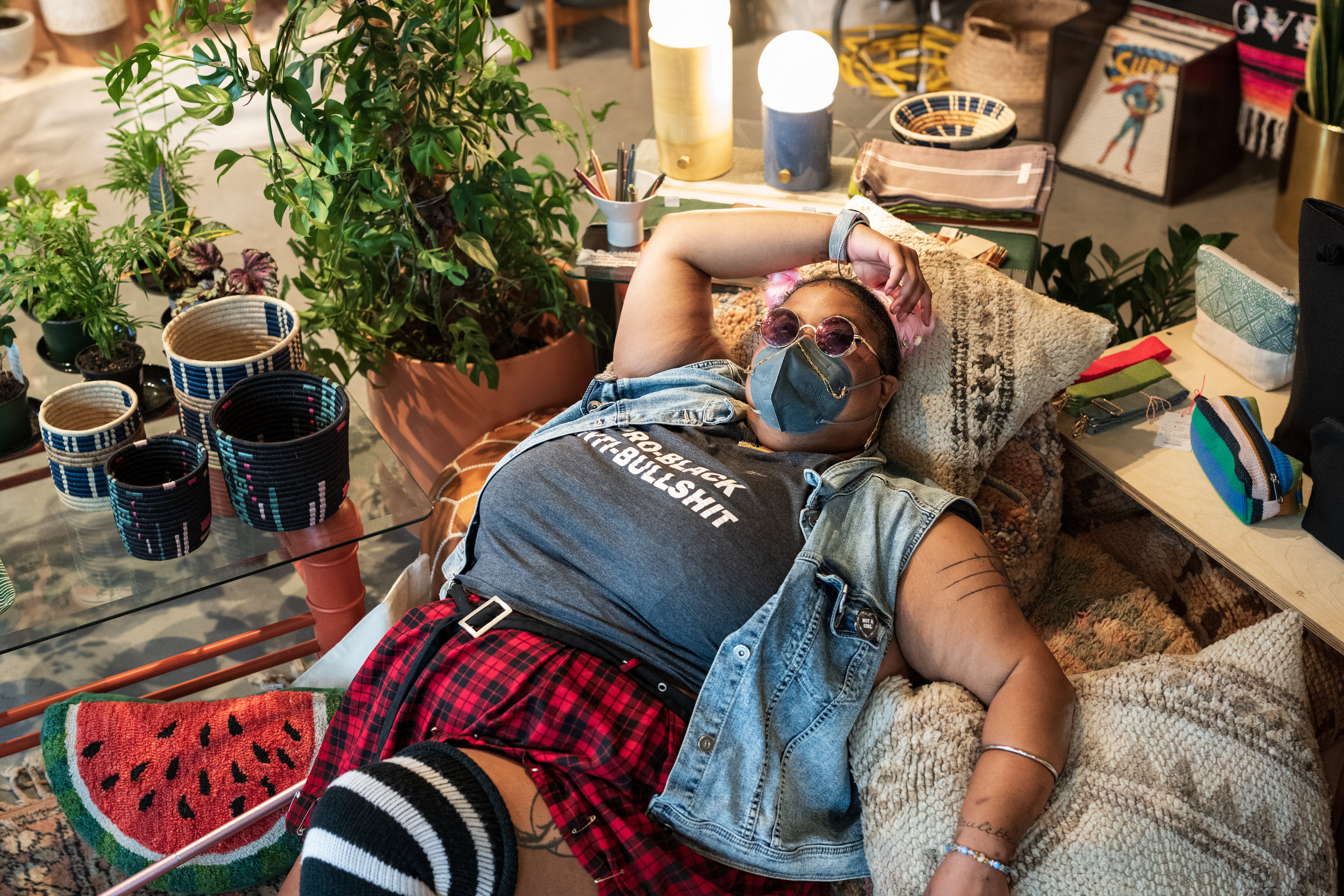 Top-down capture of a non-binary Black person lying back on top of various throw pillows, with one arm arched above their head. They wear tinted purple sunglasses, a KN-95 mask adorned by a double gold chain, and a “Pro-Black Anti-Bullshit” tank top paired with a denim vest and plaid skirt. A pink cane rests next to the person on a watermelon pillow.