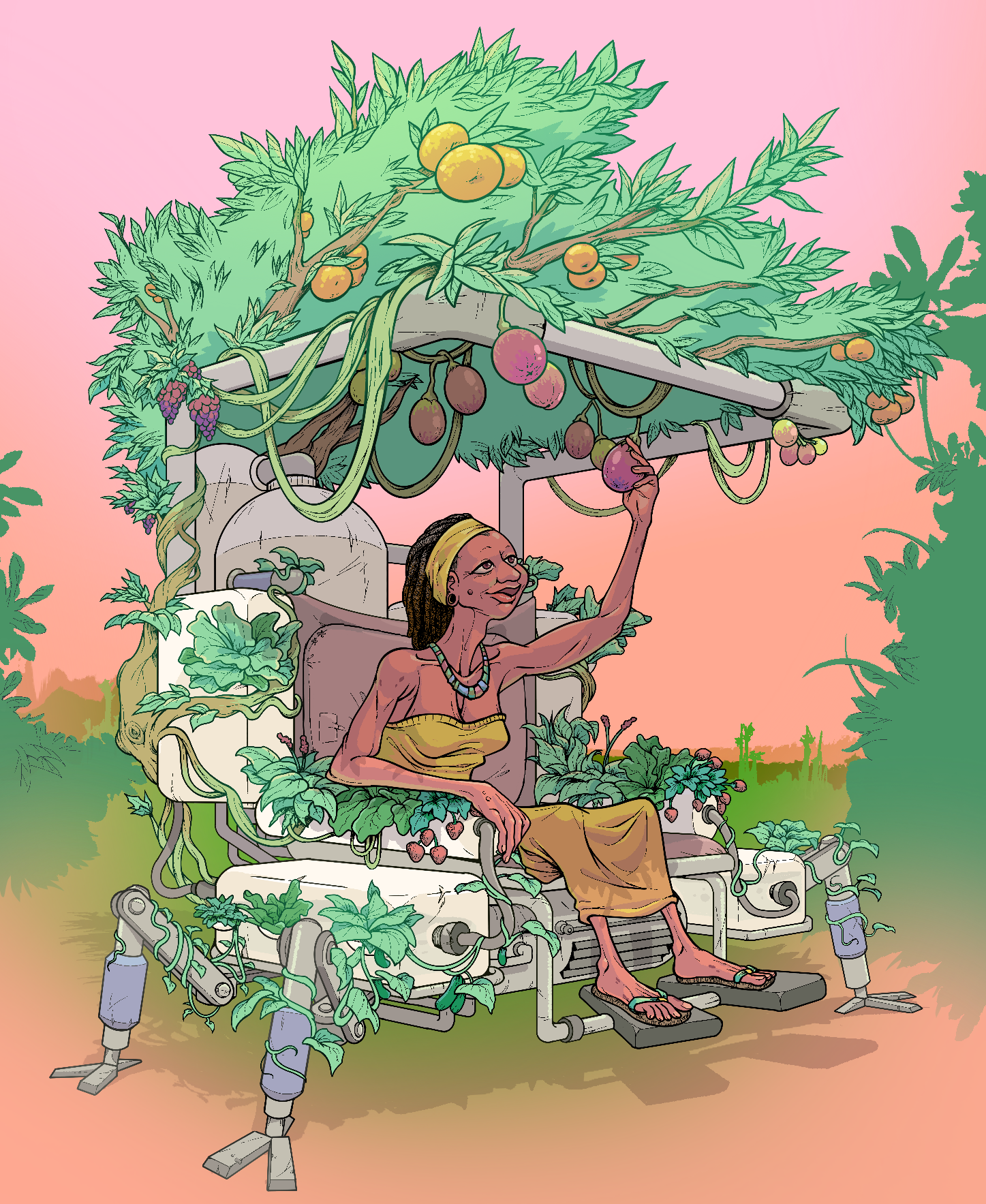 Illustration of a Black woman Elder sitting in a grand mobility chair embroidered with vines, fruit, and foliage. The chair is mechanized with robotic feet and connected to a hydroponic garden, with a leafy canopy roof. The woman reaches up to grab a passion fruit off the canopy. She wears a headscarf, long locs, choker, ankle-length tube dress, and sandals.