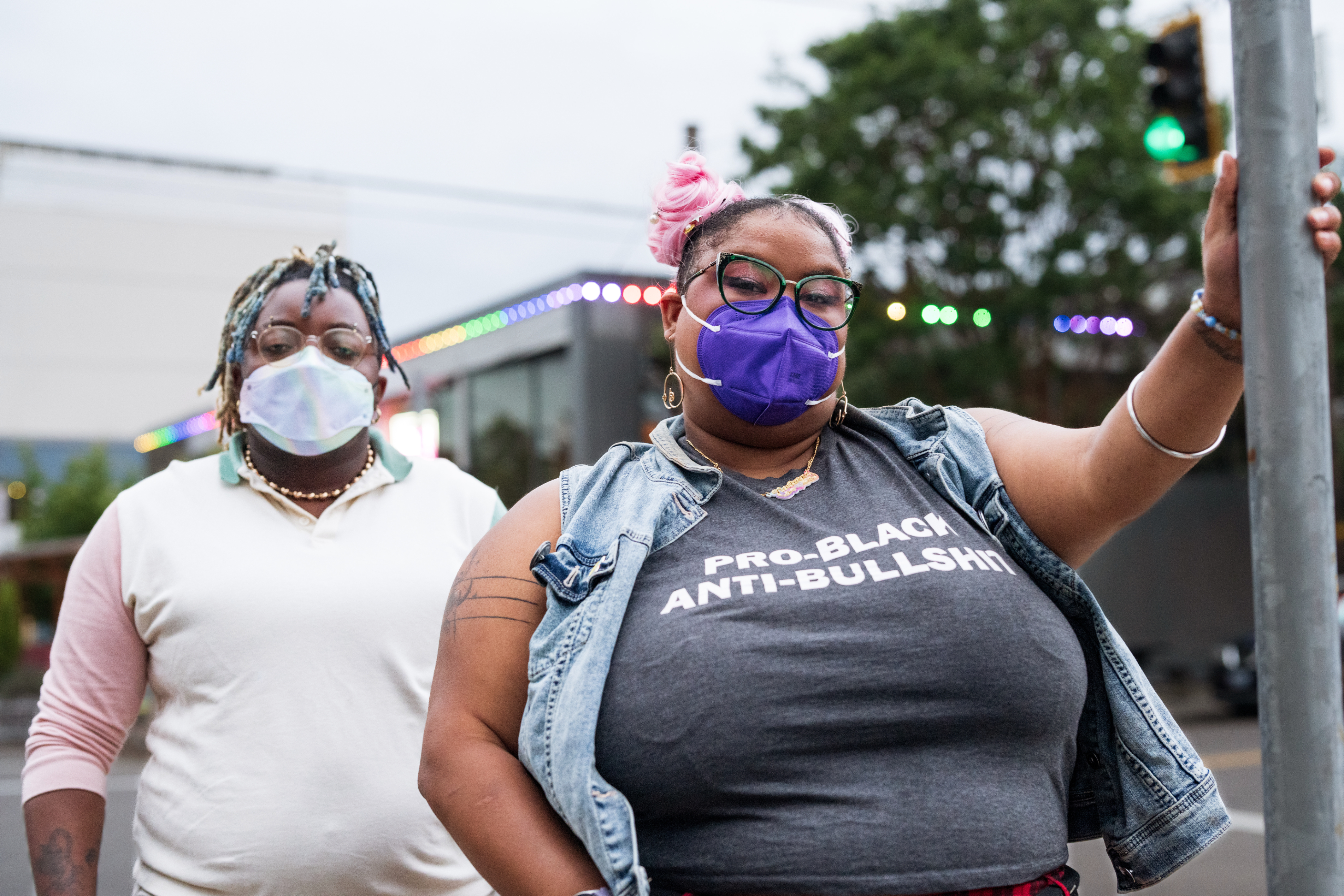 Close-up of two disabled Black people looking slightly downwards at the camera. On the left, the transmasculine Black person has complemented a holographic rainbow mask with their ombré blonde and blue locs, oval glasses, gold jewelry, and white shirt with mint and pink quarter sleeves. The non-binary Black person in the center casually grasps a street pole and has pink space buns, cat eye glasses, a purple mask, and a denim vest over a tank that says “Pro-Black Anti-Bullshit.” In the background, a building with rainbow lights caps off the scene.
