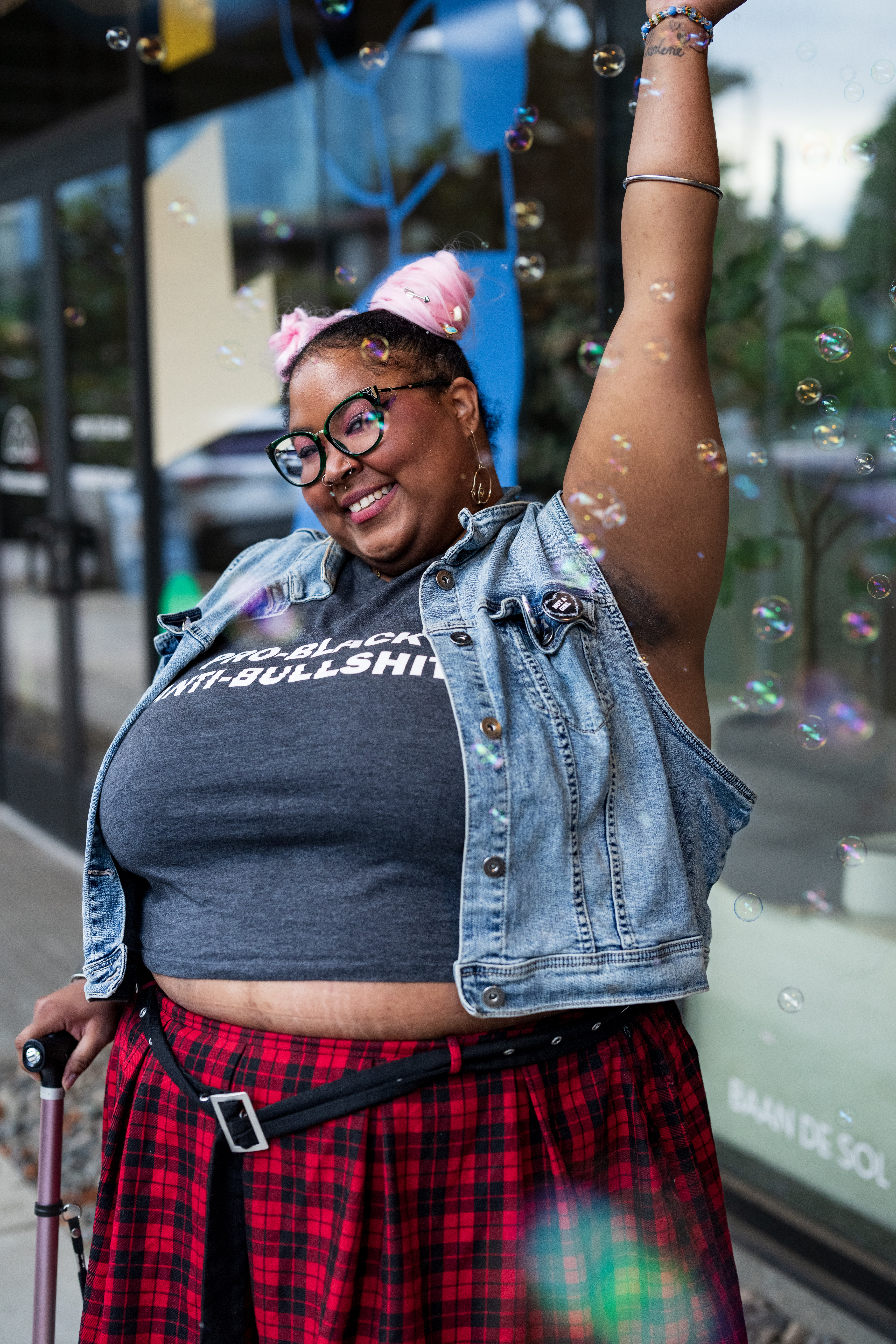 A non-binary Black person with tinted sunglasses and space buns leans back in a chair, their face mask adorned with a gold double chain. They’re modeling a tank top reading “Pro-Black” on one line and “Anti-Bullshit” below, complemented by a denim vest, plaid skirt, striped knee high socks, and a metallic pink cane.